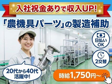 【ア】入社祝金ありで収入UP!「農機具パーツ」の塗装補助・ハンガー掛け作業★日払いOK/2交替